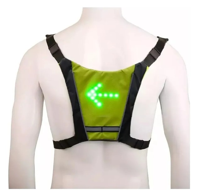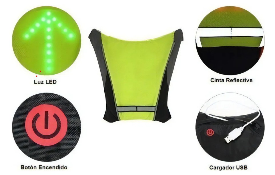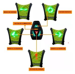 Equipado con luces LED direccionales, función de freno, alerta y movimiento, este chaleco inteligente garantiza que seas visible desde largas distancias. Olvídate del riesgo de no ser visto por otros conductores.
